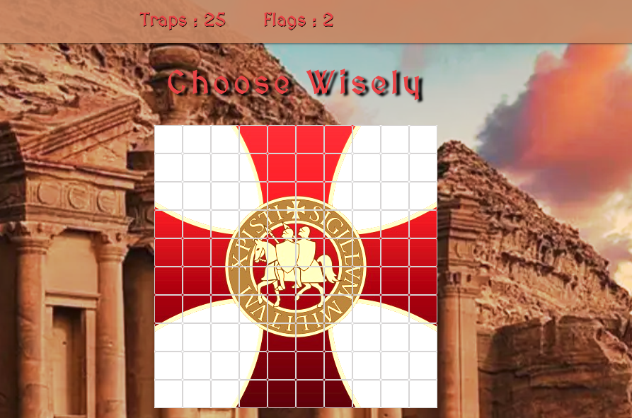 Embark on an adventurous journey with "Choose Wisely" - an exciting web-based game that blends the classic gameplay of Minesweeper with the thrilling theme of Indiana Jones and the Last Crusade. Built using JavaScript, HTML, and CSS, "Choose Wisely" offers a challenging and immersive gaming experience.